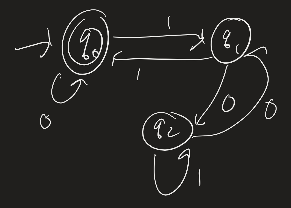 Then the idea is to get rid of states, one by one, and relabel using regular expressions. For each pair of states $q$ and $q^\prime$ left, we compute all the ways of getting from $q$ to $q^\prime$, including by using a state you just removed. So for example, if we remove $q_2$, we look at how to get from $q_1$ to $q_1$: we can first go to $q_2$ with a 0, then take the self-loop with a 1, then come back to $q_1$ with a 0: