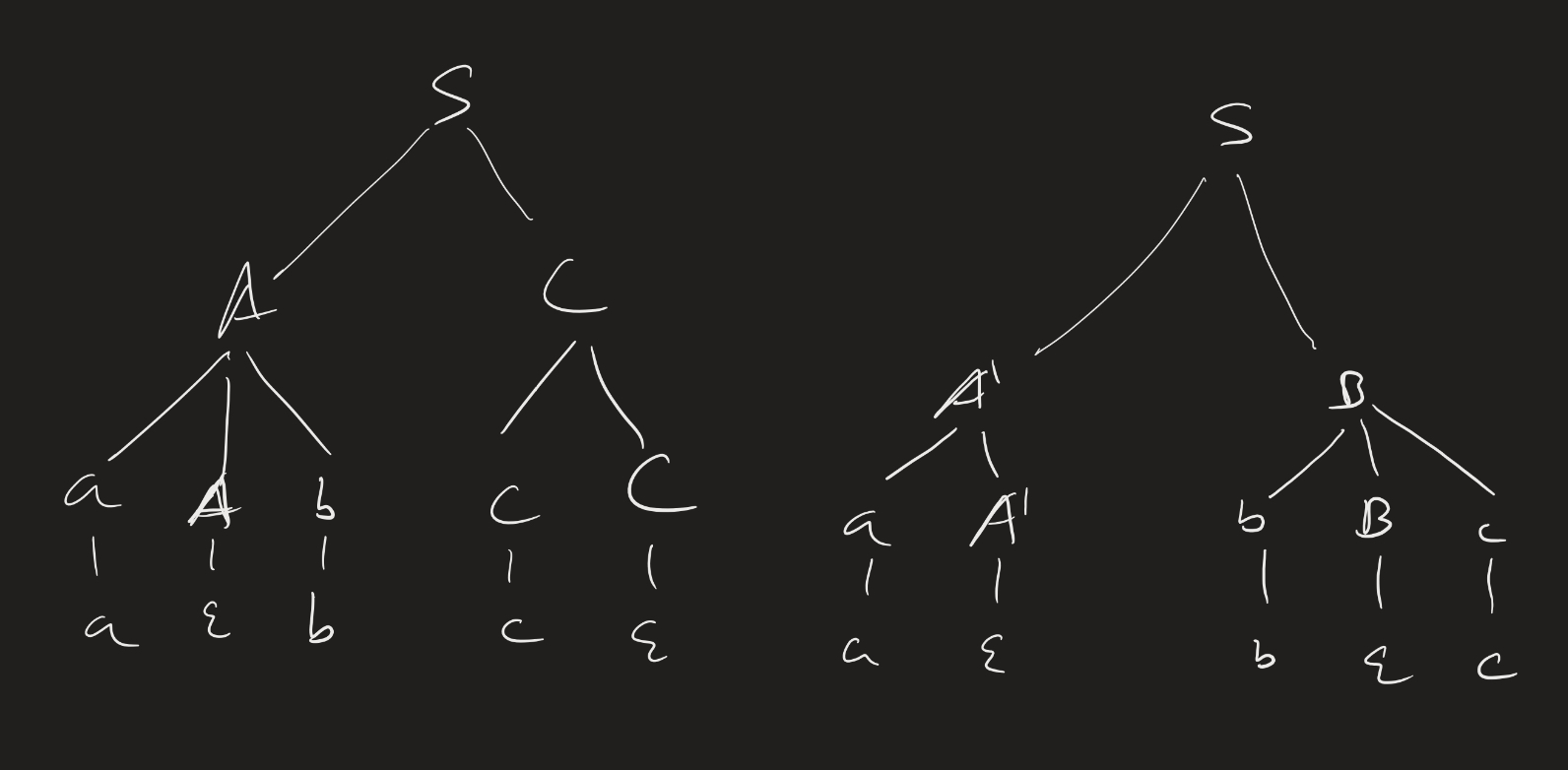 \[\begin{align} S &\rightarrow AC | A^\prime B \\ A &\rightarrow aAb | \varepsilon \\ C &\rightarrow cC | \varepsilon \\ A^\prime &\rightarrow a A^\prime | \varepsilon \\ B &\rightarrow bBc | \varepsilon \end{align}\]Consider the word $abc$. We can derive this in a few ways:
